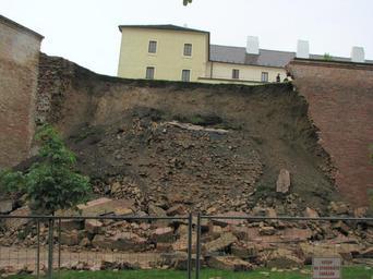 Keywords: Špilberk, collapsed wall (3).jpeg cs Zřícená část hradeb hradu Špilberk v Brně en Collapsed portion of the walls of Špilberk Castle Brno Czech Republic own DaBler 2010-06-16 49 11 41 933 N 16 35 53 114 E Špilberk Castle