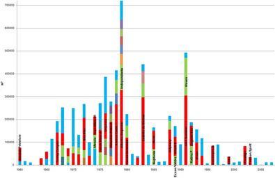 Keywords: Spill Volume.PNG en Oil spills by tankers; In red the largest spill that year by one tanker In lightblue all spills smaller then 30000 m3 combined Other colours single spills larger then 30000 m3 own based on http //www c4tx org/ctx/job/cdb/prod/search html CTX Casualty Database BoH 2008-09-06 Based on spills of more then 1000 m3 in the http //www c4tx org/ctx/job/cdb/prod/search html CTX Casualty Database Oil tankers |