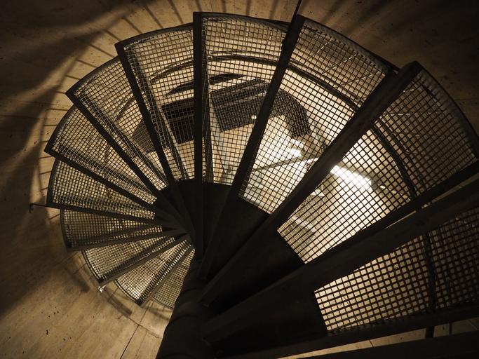 Keywords: spiral staircase descent gradually stair step spiral staircase finish down stairs get off steel grid mesh steps