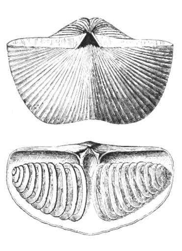 Keywords: Spirifer striatus.jpg en Sprifer striatus<br/> <br/> bottom Interior of Dorsal Valve http //ia700305 us archive org/25/items/manualofgeologyt00dana/manualofgeologyt00dana pdf Manual Of Geology by James D Dana Obsidian Soul 1863 Spirifer striatus |