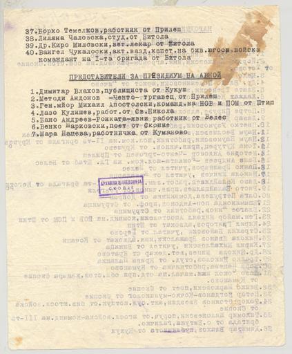 | Keywords: Spisok na delegati vo avnoj 2.jpg  mk Список на делегати исп атени од АС О во АВ ОЈ вто а ст аница en The list of names of delegates for AVNOJ from Macedonia second page DARM archive 1944-08-02 The State Archives of the Republic of Macedonia DARM anonymous other versions cc-zero Wikipedian in Residence at DARM ASNOM AVNOJ Uploaded with UploadWizard |