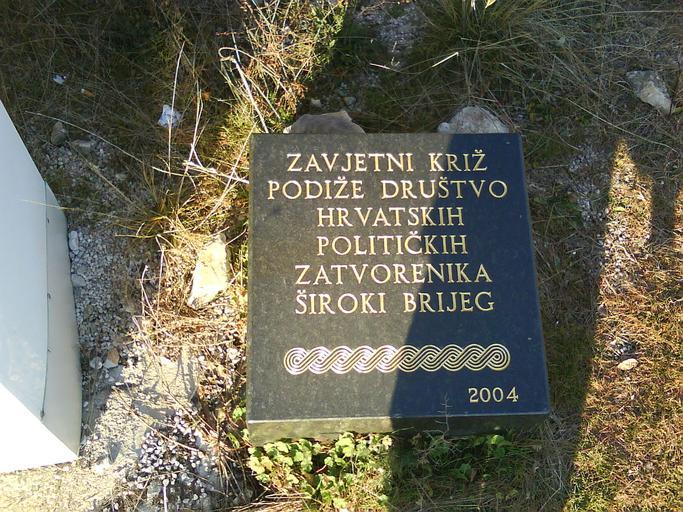 | Keywords: Spomen ploča-zavjetni križ-utvrda-ŠB.jpg Spomen ploča pokraj zavjetnog križa kraj talijanske utvrde u Širokom Brijegu A memorial plaque next to cross next to Italian fort above Široki Brijeg own 2009-01-17 Anto <span class signature-talk >talk</span> 11 44 10 May 2009 UTC Italian fort in Široki Brijeg Monuments in Široki Brijeg Plaques in Bosnia and Herzegovina |