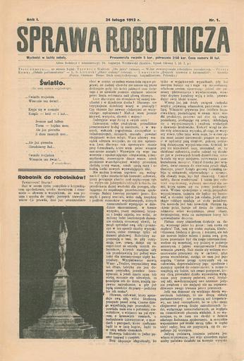 Keywords: Sprawa Robotnicza (an anarchist weekly 1912).jpg en The first issue of an anarchist weekly from Cracow called Sprawa Robotnicza Workers Cause pl Pierwszy numer krakowskiego tygodnika anarchistycznego Sprawa Robotnicza The library Augustyn Wróblewski 1912-02-24 PD-old Periodicals about anarchism Anarcho-Syndicalism Magazines of Poland Periodicals of Austria Newspapers of Austria