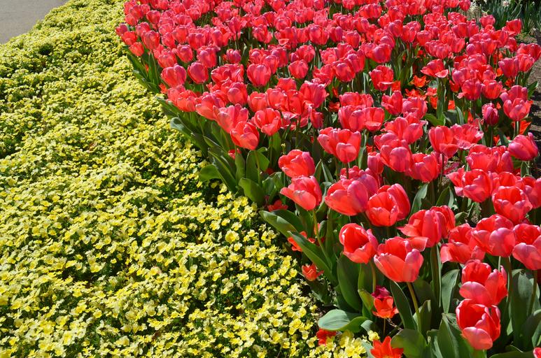 Keywords: spring flowers nature landscaping garden seasons earth day meadow natural beauty blooming outdoor diy colorful tulips yellow pink bright environment