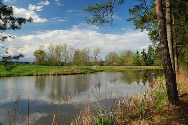 Keywords: spring landscape water-level signs of spring pond blue sky trees reflection water spring landscape south bohemia nature clouds bank dry grass trhové sviny trhosvinensko fishing ground