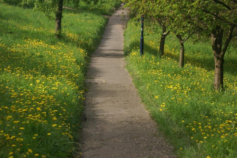 Keywords: spring path dandelions tree nature flowering
