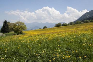 Keywords: spring sunshine may mountains trees nature landscape green meadow dandelion yellow clouds sky blue white