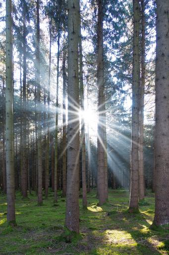 Keywords: spruce forest conifer tree nature moss back light sun rays