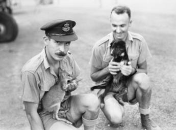 Keywords: australian war memorial australianwarmemorial moustache kangaroos soldiers dog raaf greenwood agnew 31 squadron 31squadron commons:event=commonground2009 possibly wallaby? wallaby mascot mascots pet pets animal animals joey canis canine marsupial mammal australia coomalie creek coomaliecreek northern territory northernterritory squadron kangaroo cap hat flight lieutenant flightlieutenant sergeant g. a. greenwood gagreenwood b. agnew bagnew beaufighter 1943 movember blackandwhite monochrome black and white ID Number: NWA0031 Coomalie Creek, Northern Territory. Two members of No. 31 (Beaufighter) Squadron RAAF, holding the squadron mascots, a joey (young kangaroo) and a dog. Left to right: Flight Lieutenant G. A. Greenwood and Sergeant B. Agnew. Rights Info: No known copyright restrictions. This photograph is from the Australian War Memorial's collection www.awm.gov.au Persistent URL:http://cas.awm.gov.au/item/NWA0031 ID Number: NWA0031 Coomalie Creek, Northern Territory. Two members of No. 31 (Beaufighter) Squadron RAAF, holding the squadron mascots, a joey (young kangaroo) and a dog. Left to right: Flight Lieutenant G. A. Greenwood and Sergeant B. Agnew. Rights Info: No known copyright restrictions. This photograph is from the Australian War Memorial's collection www.awm.gov.au Persistent URL:http://cas.awm.gov.au/item/NWA0031 |