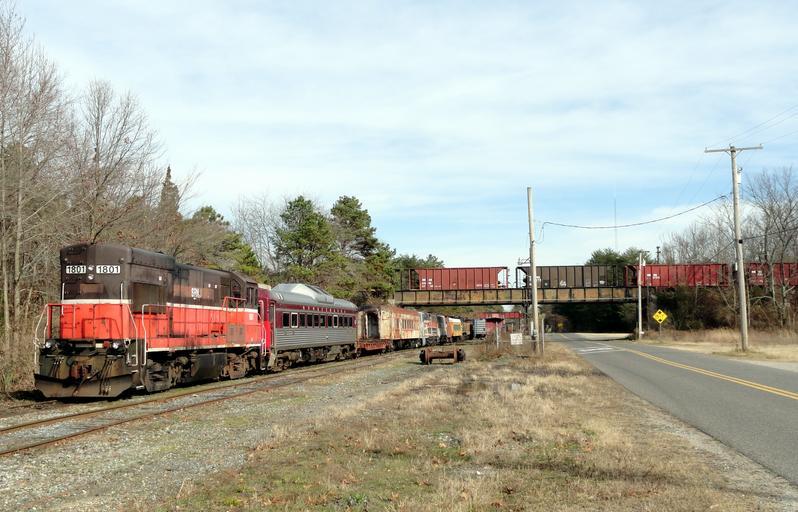 | Keywords: SRNJ Winslow Jct 2011a.jpg Southern Railroad of New Jersey in Winslow Township New Jersey Looking northeast towards the end-of-track The Vineland Railway built the rail line in the 1860s southward to Vineland New Jersey Vineland the current terminus of the SRNJ Vineland Railway was later leased by the New Jersey Southern Railroad which itself was succeeded by the Central Railroad of New Jersey and Conrail <br/><br/> SRNJ locomotive no 1801 a model GE U18B U18B built by General Electric is on a siding with rolling stock acquired by SRNJ from various railroads In the middle ground is a trestle with coal hoppers on the Beesley Point Secondary line of Conrail Shared Assets Operations A connecting track to SRNJ is located to the right outside of this photo In the distance is a trestle for the Atlantic City Line of New Jersey Transit Own Caseyjonz 2011-11-27 39 66263 -74 85105 region US-NJ_type landmark_heading NE Winslow Township New Jersey GE U18B locomotives Southern Railroad of New Jersey |