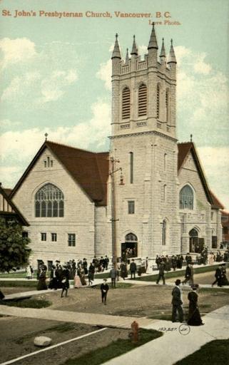 Keywords: outdoor architecture building "St. John's Presbyterian Church, Vancouver, B. C. Love Photo." Souvenir Post Card, The Valentine & Sons' Publishing Co., Ltd. Montreal and Toronto St. John's Presbyterian Church at 1401 Comox Street (NW corner of Comox and Broughton Sts.) in Vancouver, BC. 1909 photograph (attributed to Phillip Timms). Church built 1906. Architect: John J. Honeyman. Dedicated in 1907; Became St. John's United Church in 1928. Destroyed by fire in 1974. "St. John's Presbyterian Church, Vancouver, B. C. Love Photo." Souvenir Post Card, The Valentine & Sons' Publishing Co., Ltd. Montreal and Toronto St. John's Presbyterian Church at 1401 Comox Street (NW corner of Comox and Broughton Sts.) in Vancouver, BC. 1909 photograph (attributed to Phillip Timms). Church built 1906. Architect: John J. Honeyman. Dedicated in 1907; Became St. John's United Church in 1928. Destroyed by fire in 1974. St. John's Presbysterian Church (Vancouver) 1909.jpg de Vancouver St John's Presbysterian Church 1909 postcard anonymous 1909 PD-old Churches in Vancouver "St. John's Presbyterian Church, Vancouver, B. C. Love Photo." Souvenir Post Card, The Valentine & Sons' Publishing Co., Ltd. Montreal and Toronto St. John's Presbyterian Church at 1401 Comox Street (NW corner of Comox and Broughton Sts.) in Vancouver, BC. 1909 photograph (attributed to Phillip Timms). Church built 1906. Architect: John J. Honeyman. Dedicated in 1907; Became St. John's United Church in 1928. Destroyed by fire in 1974. |