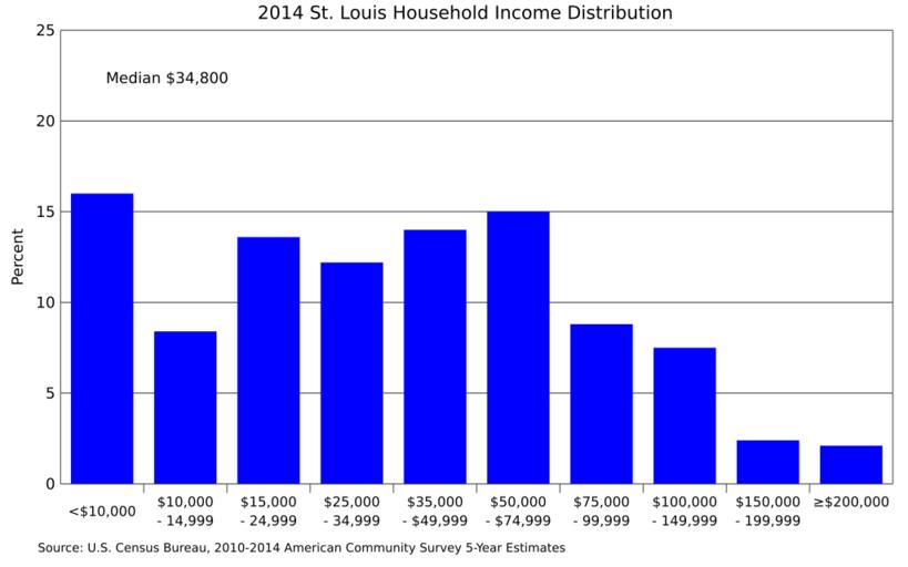 Keywords: St Louis household income distribution.svg translate yes en Distribution of household income in St Louis Missouri Data from http //factfinder census gov/bkmk/table/1 0/en/ACS/14_5YR/DP03/0500000US29510 US Census in 2014 inflation adjusted dollars 2016-06-04 own Delphi234 other versions cc-zero Income distribution in the United States St Louis Missouri |