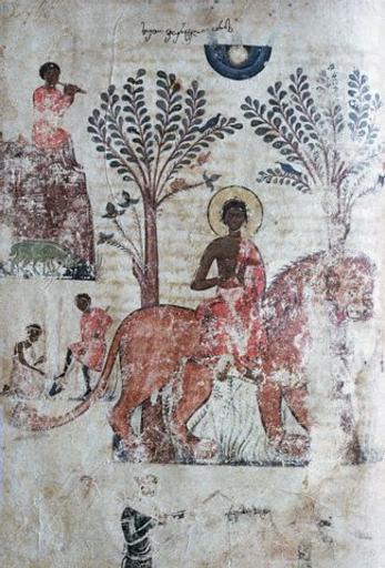 Keywords: St. Mamas.jpg St Mamas A folio from the medieval Georgian manuscript Internet currently defunct website about Georgian culture anonymous century 12 PD-old-100 Saint Mammes Essays of Gregory of Nazianzus