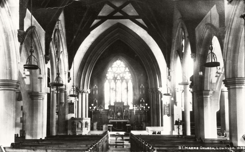 | Keywords: St Mark Low Moor interior (2).jpg  Old postcard view of the interior of the former church of St Mark Low Moor Bradford West Yorkshire England The church was designed by Mallinson Healey and consecrated in 1857 The carving on the church was executed by Catherine Mawer Scan of postcard 1935 author PD-art-70 St Mark Low Moor archive images Naves in England |