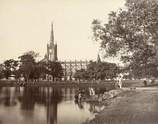 | Keywords: St Paul's Cathedral in Calcutta in 1865.jpg en This photograph of St Paul's Cathedral in Calcutta was taken by Oscar Mallitte in 1865 to form part of an album entitled 'Photographs of India and Overland Route' It shows a view of the cathedral looking across the Birjee Tank water supply on the south-east corner of the Maidan The cathedral was designed in the Indo-Gothic style by William F Forbes Forbes a military engineer who was later promoted to Major General was also responsible for the design of the old Calcutta Mint where he held the post of Mint Master for a time Construction of the cathedral began in 1839 when the foundation stone was laid by Daniel Wilson Bishop of Calcutta and completed in 1847 The tall central spire and square tower beneath were inspired by a similar feature at the twelfth century cathedral in Canterbury England The upper portion of the tower which originally reached a height of sixty-one metres was destroyed in an earthquake in 1934 1865 http //www oldindianphotos in/2008_12_14_archive html Oscar Mallitte Custom license marker 2014 09 08 PD-old-100-1923 Uploaded with UploadWizard Kolkata in the 1860s |