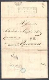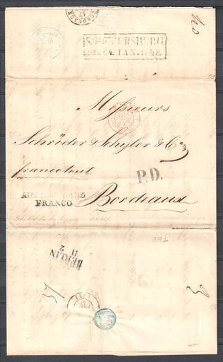 Keywords: St Petersburg 1848 Dob0102306.jpg en Russia stampless folded letter to France 'St PETERSBURG DEN 24 IAN 1848 ' boxed cancel manuscript 'franco tout' Black 'P D ' straight line 'AUS RUSSLAND FRANCO' French 'PRUSSE VALENCIENNES 15 FEVR 48' c d s Transit postmark Paris and Bordeaux 17 FEVR 48 arrival Details January 24 1848 Julian paid letter posted at St Petersburg Sender wrote 'franco tout' Not restated at post office The postmark 'St PETERSBURG DEN 24 IAN 1848' was applied Dobin 1 02 type 3 06 Reception expedition of foreign correspondence used 1844-1853 Rarity 4 <ref> cite book Manfred Dobin Postmarks of Russian Empire Pre adhesive period St Petersburg Standard Kollektion 1993 9785853870222 </ref> February 11 Gregorian 'BERLIN 11 2' typical Berlin transit postmark and 'AUS RUSSLAND FRANCO' applied Based on the usual presence of these Berlin postmarks this 'AUS RUSSLAND FRANCO' marking is regarded as a Berlin mark White Aus Russland type B3 February 15 red 'PRUSSE VALENCIENNES 15 FEVR 48 3' French entry mark at Valenciennes 3's show the postmark was struck at Paris Letter was also marked by the French with 'P D ' Payee au Destination Noël 1021<ref> cite book Gilbert Noël Catalogue des oblitérations des chiffres-taxe carrés de France 1859-1878 1956 Paris E H de Beaufond </ref> February 15 blue 'PARIS 15 FEVR 48 60 ' transit postmark February 17 'BORDEAUX 17 FEVR 48 32 ' arrival backstamp 1848 Scan of original Postal authorities Sources reflist PD-old-100 Stampless covers of Russia Marque d'entrée en France Gare de Valenciennes Postmarks of Saint Petersburg Entry and transit postmarks of Germany 1848 postmarks
