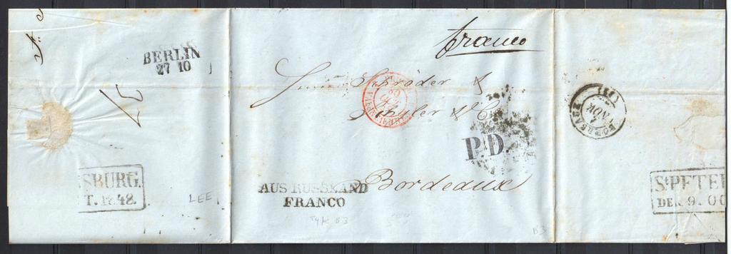 | Keywords: St Petersburg 1848 Dob0102306b.jpg en Russia stampless folded letter to France 'St PETERSBURG DEN 9 OCT 1848 ' boxed cancel manuscript 'franco' Black 'P D ' straight line 'AUS RUSSLAND FRANCO' French 'PRUSSE VALENCIENNES 30 OCT 48' c d s Bordeaux 1 NOV 48 arrival Details October 9 1848 Julian paid letter posted at St Petersburg Sender wrote 'franco' Not restated at post office The postmark 'St PETERSBURG DEN 9 OCT 1848' was applied Dobin 1 02 type 3 06 Reception expedition of foreign correspondence used 1844-1853 Rarity 4 <ref> cite book Manfred Dobin Postmarks of Russian Empire Pre adhesive period St Petersburg Standard Kollektion 1993 9785853870222 </ref> October 27 Gregorian 'BERLIN 27 10' typical Berlin transit postmark and 'AUS RUSSLAND FRANCO' applied Based on the usual presence of these Berlin postmarks this 'AUS RUSSLAND FRANCO' marking is regarded as a Berlin mark White Aus Russland type B3 October 30 red 'PRUSSE VALENCIENNES 30 OCT 48 3' French entry mark at Valenciennes 3's show the postmark was struck at Paris Letter was also marked by the French with 'P D ' Payee au Destination Noël 1021<ref> cite book Gilbert Noël Catalogue des oblitérations des chiffres-taxe carrés de France 1859-1878 1956 Paris E H de Beaufond </ref> No readable transit postmark but likely transit in Paris on October 30 November 1 'BORDEAUX 1 NOV 32 ' arrival backstamp 1848 Scan of original Postal authorities Sources reflist PD-old-100 Stampless covers of Russia Marque d'entrée en France Gare de Valenciennes Postmarks of Saint Petersburg Entry and transit postmarks of Germany 1848 postmarks |