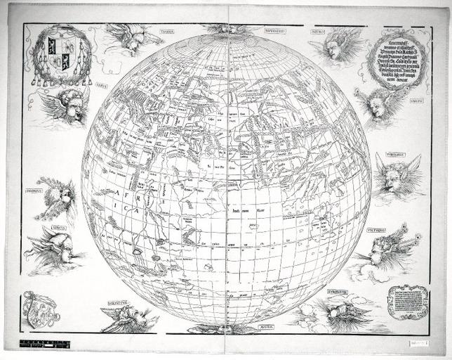 | Keywords: Stabius map of the world.jpg  en Carl Ritter's 1847 impression of Johann Stabius's 1515 world map whose engraving is credited to Albrecht Dürer A planisphere globe surrounded by the twelve winds equivalent to Ptolemy's third projection The arms of Matthäus Cardinal Lang von Wellenburg archbishop of Salzburg at upper left; the arms of Johann Stabius imperial astrologer at lower left Dedication to Cardinal Lang at upper right; imperial privilege and date at lower right 63 9 x 85 0 cm Presented to the British Museum by the Austrian Imperial Library in Vienna in November 1848 la Reverendiss domino et illustriss Principi Dño Matheo T Angeli Diacono Cardinali Gurceñ Sa Caẽs Mtis per Italia locũtenenti generali vdño suo colen Joañ Stabius Au hãc orb imaginem dedicat Imp Caes niuus Maximilianus P F Aug Privilegio caiut nequis Libros membraenas cartas pictu'as volumĩa vel quecuqe alia que Ioan Stabius Au sub suo titulo nomie emiserit sine sua expressa voluntate In decem annis a die editioĩs sequentibus imprimat sub pena amissionis rerum impressarum decem mâcharum auri puri 1 5 1 5 1847 http //www britishmuseum org/research/collection_online/collection_object_details aspx objectId 1522306 partId 1 people 127877 from ad fromDate 1514 to ad toDate 1516 page 3 British Museum 1848 1111 8 Johann Stabius after Ptolemy al other versions <gallery> Stabius map of the world II jpg File Stabius-Durer world map jpg </gallery> PD-old-70-1923 1840s maps of the world 1847 maps Maps in Latin Stabius world map 1847 Carl Ritter Collections of the British Museum |