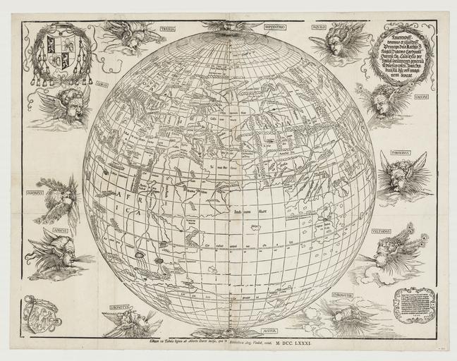 | Keywords: Stabius world map II.jpg  en A 1781 copy of Johann Stabius's 1515 world map whose engraving is credited to Albrecht Dürer A planisphere globe surrounded by the twelve winds equivalent to Ptolemy's third projection The arms of Matthäus Cardinal Lang von Wellenburg archbishop of Salzburg at upper left; the arms of Johann Stabius imperial astrologer at lower left Dedication to Cardinal Lang at upper right; imperial privilege and date at lower right la Reverendiss domino et illustriss Principi Dño Matheo T Angeli Diacono Cardinali Gurceñ Sa Caẽs Mtis per Italia locũtenenti generali vdño suo colen Joañ Stabius Au hãc orb imaginem dedicat Imp Caes niuus Maximilianus P F Aug Privilegio caiut nequis Libros membraenas cartas pictu'as volumĩa vel quecuqe alia que Ioan Stabius Au sub suo titulo nomie emiserit sine sua expressa voluntate In decem annis a die editioĩs sequentibus imprimat sub pena amissionis rerum impressarum decem mâcharum auri puri 1 5 1 5 Editum ex Tabula lignea ab Alberto Durer incisa quae in Bibliotheca Augustae Vindobonae extat M DCC LXXXI 1781 http //archival-classic sl nsw gov au/album/albumView aspx itemID 913699 acmsid 0 Dixon Map Collection at the State Library of New South Wales Z/Cc 78/2 Johann Stabius after Ptolemy al other versions <gallery> File Stabius world map jpg </gallery> PD-old-70-1923 PD-100 1780s maps of the world 1781 maps Maps in Latin Stabius world map 1781 Dixon Map Library Library of New South Wales Adam von Bartsch |