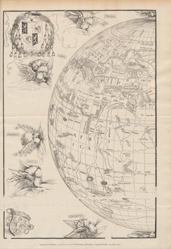 | Keywords: Stabius world map L.png  en The left half of Johann Stabius's 1515 world map whose engraving is credited to Albrecht Dürer A planisphere globe surrounded by the twelve winds equivalent to Ptolemy's third projection The arms of Matthäus Cardinal Lang von Wellenburg archbishop of Salzburg at upper left; the arms of Johann Stabius imperial astrologer at lower left Dedication to Cardinal Lang at upper right; imperial privilege and date at lower right la Reverendiss domino et illustriss Principi Dño Matheo T Angeli Diacono Cardinali Gurceñ Sa Caẽs Mtis per Italia locũtenenti generali vdño suo colen Joañ Stabius Au hãc orb imaginem dedicat Imp Caes niuus Maximilianus P F Aug Privilegio caiut nequis Libros membraenas cartas pictu'as volumĩa vel quecuqe alia que Ioan Stabius Au sub suo titulo nomie emiserit sine sua expressa voluntate In decem annis a die editioĩs sequentibus imprimat sub pena amissionis rerum impressarum decem mâcharum auri puri 1 5 1 5 1888 http //digi ub uni-heidelberg de/diglit/jbksak1888a/0231 Heidelberger Historische Bestände credited to the July 1888 Jahrbuch der Kunsthistorischen Sammlungen des Allerhöchsten Kaiserhauses Johann Stabius after Ptolemy c other versions <gallery> File Stabius world map R png the right half </gallery> PD-old-70-1923 LlywelynII Maps in Latin Stabius world map 1888 1880s maps of the world 1888 maps |