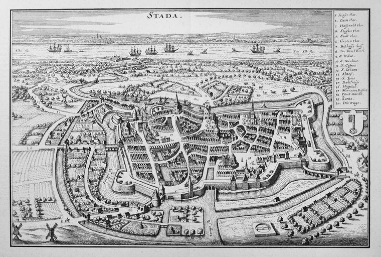 Keywords: Stada (Merian).jpg Artwork creator Matthäus Merian b 1653 copper engraving object history exhibition history credit line de accession number Topographia Saxoniae Inferioris Frankfurt am Main 1653 PD-100 Engravings of Topographia Saxoniae Inferioris Stade Maps of Stade 1653 Merian |