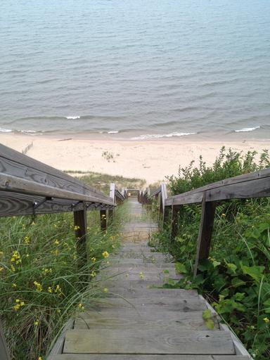 Keywords: stairs steps long beach ocean shore lake railing stairway staircase climb down access sand coast water sea vacation holiday climbing passage