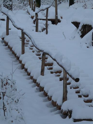 Keywords: stairs wood stairs winter snowy snow ice cold gradually rise