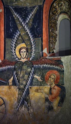Keywords: StaMaria Aneu MNAC-015874 0006.jpg La decoració de l ™absis de Santa Maria d ™Ã neu és una mostra de la superposició de temes i motius de l ™Antic i del Nou Testament a la pintura romànica catalana A la volta hi ha representada l ™Epifania amb Maria en Majestat i els Mags Al registre inferior apareixen els dos serafins de la visió d ™Isaïes al temple de Jerusalem Is 6 3-6 que canten «S AN C TU S S AN C TU S S AN C TU S» i apropen les tenalles amb brases ardents als llavis dels profetes Elies i Isaïes Al mig les quatre rodes de foc del carro de Jahvè al·ludeixen a la visió d ™Ezequiel Ez 1 15 Cal subratllar també el protagonisme dels tres arcàngels Miquel Gabriel i Rafael advocats el dia del Judici Final Aquesta original temàtica troba la seves fonts en repertoris bizantinitzants d ™Itàlia Final s XII - inici s XI Fresc 700 x 410 x 210 cm exhibition history credit line accession number 015874 own ca user amadalvarez Date 2012-07-30 10 44 23 PD-Art Apse of Santa Maria d'à neu