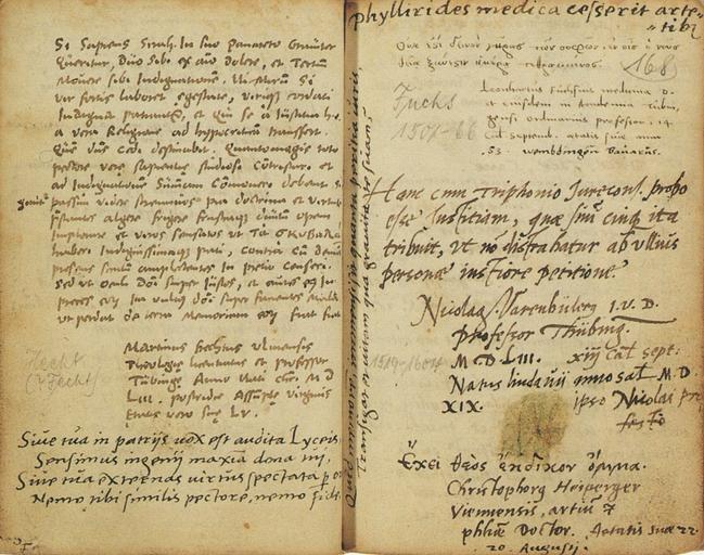 | Keywords: Stammbuch J V Deyger.jpg Doppelseite mit Eintragungen vom August 1553 aus dem Stammbuch des Johann Valentin Deyger 1552 “1554 Universitätsbibliothek Tübingen Mh 1030 Kostbarkeiten aus alter und neuer Zeit ISBN 3-88705-032-0 - 1552 1554 diverse Autoren Reproduction of a mansucript that is in the public domain because of its age PD-old 16th-century manuscripts Stammbuch Universitätsbibliothek Tübingen | ||||