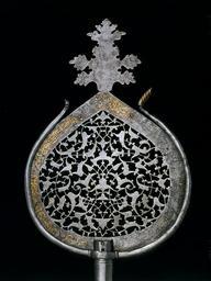 Keywords: Standarspets från 1500-talet - Livrustkammaren - 4210.tif LSH artwork sv Helt av stål bestående av en ca 45 mm tjock skiva av rundoval form med en synlig bredd av 240 mm och upptill utdragen i en lång spets Skivan helt genombruten av ett arabeskliknande rankmönster inom en slät ca 26 mm bred bård med påslagen guldtext i fin rayhani -skrift <br/>På den bäst bevarade sidan enl Welch uppifrån från v sida Allah Muhammed Ali samt tolv ovala kartuscher med de tolv shia-imamerna Ali 656-661 kalif ; sonen al-Hassan 661-670 ; dennes broder al-Husain 670-680 ; dennes son Ali Ali ibn al-Husajn Zayn-al-Abi din 680-694 ; och därefter i rätt nedstigande led Muhammad al-Bakir 694-734 ; Djafar al-Sadik 743-765 ; Musa al-Kazim 765-799 ; Ali al-Rida 799-818 ; Muhammed Gawad al-Taki 818-835 ; Ali al-Naki 835-868 ; al-Hasan al-Askari 868-873 och slutligen Muhammed al-Mahdi 873-879 försvann vid 12 års ålder i en håla Texten på motsatta sidan är så gott som utplånad men har troligen omfattat Allah Muhammed och Alis namn samt möjligen samma namn som på motsatta sidan men troligare tolv budord om Islam Shiismen och den Safavidiska staten Skivans spets upptill övergående i ett symmetriskt flikigt ca 116 mm högt bladornament med spår av påslagen ornering i guld <br/>Skivan upp till spetsen infälld i en slät rundstavig ram vars övre söndriga delar är utåtböjda på den ena änden rester av ett förgyllt mässingsbeslag som troligen avslutats med ett drakhuvud I skivans bård upptill två nitar den ena av koppar den andra av stål nedtill i mitten två runda hål efter nitar Spår efter ett med dessa nitar fäst beslag synligt på bården utgörande fäste för en ca 255 mm lång åttsidig nedåt vidgad holk Runt holkens mitt ett långt stavformigt ringbeslag dess nederkant med ett snett utstående beslag intill detta två motsvarande hål original caption Standarspets från 1500-talet century 16 steel - brass - gold g 400 size mm 241 holk size mm 258 size mm 615 LRK Alexej Ivanovitj Schachovskoj furste Theodor Keller Alexander Keller Persisk konst i Sverige 1973 Calligraphy in the Arts of the 1978-1979 Livrustkammarens basutställning 1978 Islamiskt i de kungliga samlingarna 1984 Kungens lockpipa 1995-1996 Hunt for Paradise Court Arts of Safavid Iran 1501-1576 2003-2004 place of origin original filename lm_t00457 47790 inventory number LRK 11128 4210 CC-BY-SA Pennants Media contributed by LSH dim-with multiple size templates Media contributed by LSH 2014-11 |