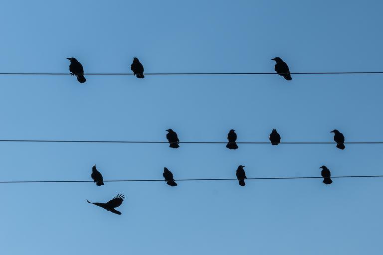 Keywords: stare power line birds persevere animal black blue resting place wait birds on power pole
