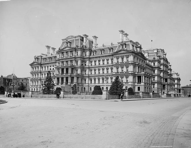 | Keywords: State, War and Navy Building 4a09424v.jpg photograph en State War and Navy Building Washington D C creator William Henry Jackson 1843-1942 photographer ; Detroit Publishing Co c1902 1 negative glass 8 x 10 in accession number LC-D401-14222 b w film copy neg LC-DIG-det-4a09424 digital file from original Call Number LC-D4-14222 <P P> P P Repository Library of Congress Prints and Photographs Division Washington D C 20540 USA http //hdl loc gov/loc pnp/pp print http //hdl loc gov/loc pnp/det 4a09424 Rights Advisory No known restrictions on publication DC Past http //dcpast com/post/51470417790/1902-state-war-navy-building <gallery> State_war_navy_building_4a09424a tif tif </gallery> PD-Detroit Washington D C in the 1900s Eisenhower Executive Office Building William Henry Jackson |