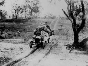 Keywords: StateLibQld 1 101068.jpg en Family travelling over rough ground in a car The car is heavily laden with possessions A man drives and a woman sits in the passenger seat and holds a baby Another woman stands on the runner board and holds onto the passenger door Three children sit on the baggage that is heaped up on the back of the vehicle The car has just come over a small hill and the road appears muddy handle 10462/deriv/69151 Item is held by John Oxley Library State Library of Queensland PD-Australia StateLibQld-License Children of Queensland Families of Australia Groups of people in Australia Automobiles of Australia Black and white photographs |