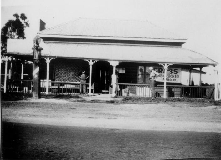 | Keywords: StateLibQld 1 101576.jpg supplied with photograph Frontal view of the house with some people in the shade on the verandah and inside A man stands in front of the house in the sun with his hands in his back pockets A petrol bowser is in front of the store A sign advertising 'Crabs' hangs on the wall ~ 1935 handle 10462/deriv/68183 Item is held by John Oxley Library State Library of Queensland PD-Australia StateLibQld-License Buildings in Brisbane | ||||