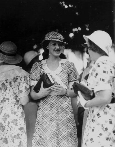 Keywords: StateLibQld 1 106856 Wearing a matching hat and dress, Miss J. Norris attended the Ascot Races, Brisbane, 1933.jpg en Wearing a matching hat and dress Miss J Norris attended the Ascot Races Brisbane 1933 Miss Norris is wearing a checked dress with white ruffles at the neck and sleeves and has a matching hat She is carrying a clutch purse 1933-12-02 handle 10462/deriv/91723 Copied and digitised from an image appearing in the Sunday Truth 3 December 1933 Contributor s Sunday Truth PD-Australia StateLibQld-License Racecourses in Queensland Women's clothing of Australia Headgear of Australia Women with hats Bags People with gloves in Australia Sports in Brisbane 1933 in Brisbane Black and white photographs Fashion in 1933 Images from Sunday Truth |