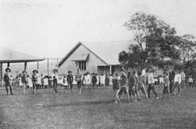 | Keywords: StateLibQld 1 108680 Boys playing a ball game at the Engelsburg State School, Queensland, ca. 1903.jpg en Boys playing a ball game at the Engelsburg State School Queensland ca 1903 circa 1903 handle 10462/deriv/127274 Copied and digitised from a booklet Fassfern district views PD-Australia StateLibQld-License Playgrounds in Queensland School children of Queensland State schools in Queensland Boys of Australia Children's clothing of Australia Kalbar Queensland 1903 in Australia Black and white photographs |