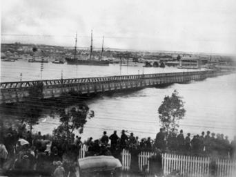 Keywords: StateLibQld 1 114424 Victoria Bridge, Brisbane, during the 1893 flood.jpg en Victoria Bridge Brisbane during the 1893 flood A view from North Quay of the wooden Victoria Bridge Brisbane during the 1893 flood with the water almost over-running the bridge An unidentified ship is moored at South Brisbane A crowd views the scene from the bank at North Quay in the foreground 1893 handle 10462/deriv/137100 Item is held by John Oxley Library State Library of Queensland PD-Australia StateLibQld-License 1893 Brisbane flood First Victoria Bridge Brisbane Black and white photographs of bridges North Quay Brisbane |