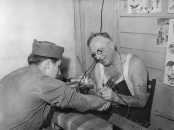| Keywords: StateLibQld 1 114552 Young American soldier gets his first tattoo, Brisbane, 1943.jpg en Young American soldier gets his first tattoo Brisbane 1943 1943-12-01 handle 10462/deriv/138130 Item is held by John Oxley Library State Library of Queensland Contributor s Queensland Newspapers Pty Ltd PD-Australia StateLibQld-License Template Picture of the month/body modification/de World War II forces of the United States in Australia Building interiors in Queensland Tattoo studios 1943 in Brisbane Black and white photographs |