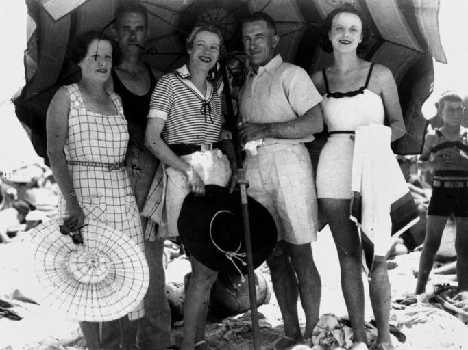 Keywords: StateLibQld 1 116096 On the beach in 1935.jpg en On the beach in 1935 Three ladies and two gentlemen found shade under a big umbrella on Southport beach One woman is wearing a pretty striped top with a sailor collar 1935-12-01 handle 10462/deriv/134672 Item is held by John Oxley Library State Library of Queensland PD-Australia StateLibQld-License Beaches of Queensland Groups of people in Australia People with hats Sailor collars 1930s fashion 1935 in Queensland Black and white photographs Men's clothing of Australia |