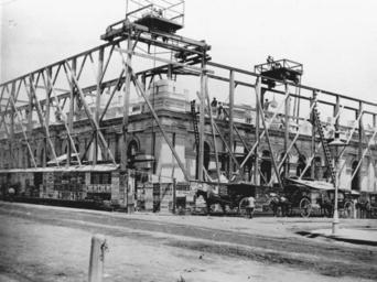 | Keywords: StateLibQld 1 116300 Construction site at the new Queensland National Bank, Brisbane, 1883.jpg en Construction site at the new Queensland National Bank Brisbane 1883 The new head office for the Queensland National Bank during the course of construction The building is on the corner of Creek and Queen Streets and is surrounded by scaffolding and barrier fences covered in posters Hansom cabs are parked in the street outside the building Two gantry cranes are positioned at the top of the scaffolding and one is lifting a large sandstone block 1883 handle 10462/deriv/139952 Item is held by John Oxley Library State Library of Queensland PD-Australia StateLibQld-License 308 Queen Street Brisbane Scaffolding Cranes in Australia Hansom cabs Posters of Australia 1883 in Brisbane Black and white photographs |