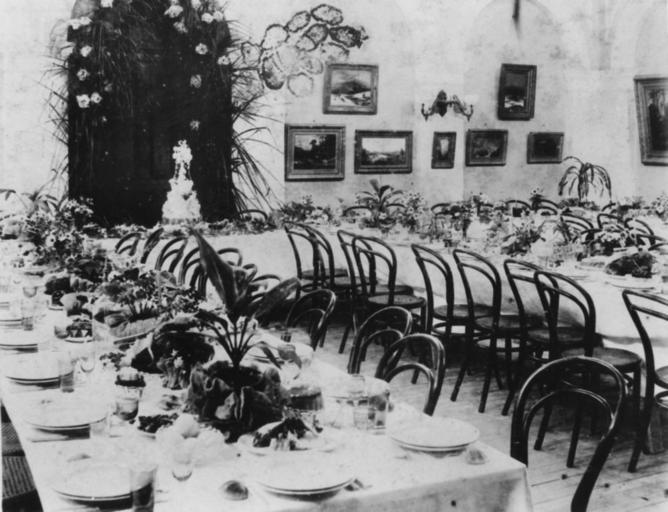 | Keywords: state library of queensland statelibraryofqueensland at our table atourtable slq food wedding wedding reception weddingreception queensland blackandwhite monochrome black and white Photographer: Unidentified Location: Merthyr, Queensland, Australia Description: Tablecloths are laid and the crockery, cutlery and glasses await the wedding party and guests. The wedding cake is at the head of the table, where the bride and groom will sit. Decorations include pot plants on the tables and a palm leaf wall hanging behind the bride and groom. Decorated for the wedding of Miss Eveline Mary Griffith, daughter of the Honorable Sir Samuel Griffith, Chief Justice of Queensland and Mr Thomas Herbert Brown at St. John's Anglican Cathedral, Wednesday, 28 November 1894. (Description supplied with photograph.) View this page at the State Library of Queensland hdl.handle.net/10462/deriv/139154 Information about State Library of Queensland’s collection: pictureqld.slq.qld.gov.au/ Photographer: Unidentified Location: Merthyr, Queensland, Australia Description: Tablecloths are laid and the crockery, cutlery and glasses await the wedding party and guests. The wedding cake is at the head of the table, where the bride and groom will sit. Decorations include pot plants on the tables and a palm leaf wall hanging behind the bride and groom. Decorated for the wedding of Miss Eveline Mary Griffith, daughter of the Honorable Sir Samuel Griffith, Chief Justice of Queensland and Mr Thomas Herbert Brown at St. John's Anglican Cathedral, Wednesday, 28 November 1894. (Description supplied with photograph.) View this page at the State Library of Queensland hdl.handle.net/10462/deriv/139154 Information about State Library of Queensland’s collection: pictureqld.slq.qld.gov.au/ <strong>Photographer: </strong>Unidentified