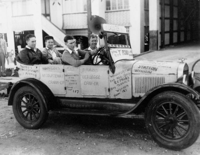 | Keywords: StateLibQld 1 117784 1927 Model T Ford equipped for a rally, ca. 1928.jpg en 1927 Model T Ford equipped for a rally ca 1928 Model T Ford 1927 model USA chassis with Australian assembly C K D tourer body without the hood Model T Ford with four drivers The car advertises local businesses such as Handyside's Garage and Woodforth's Body Repairs circa 1928 handle 10462/deriv/108015 Item is held by John Oxley Library State Library of Queensland Contributor s Queensland Newspapers Pty Ltd PD-Australia StateLibQld-License Ford Model T Ford racing cars Ford Australia Men's clothing Wynnum Queensland 1928 in Queensland Black and white photographs |