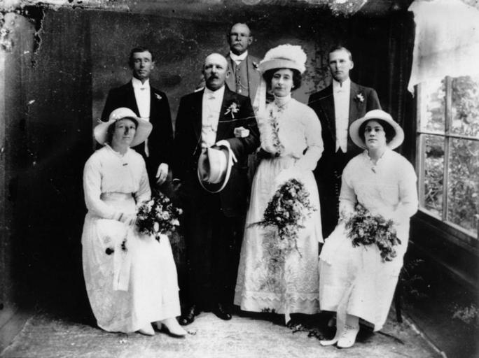 | Keywords: StateLibQld 1 137426 Wedding of Bill Greaves and Polly Jones, ca. 1912.jpg supplied with photograph Group includes two bridesmaids a groomsman and best man circa 1912 handle 10462/deriv/9690 Item is held by John Oxley Library State Library of Queensland PD-Australia StateLibQld-License Headgear of Australia People with hats Lounge suits in Australia Women's clothing of Australia Brides of Australia Bridesmaids of Australia Grooms of Australia Black and white photographs | ||||