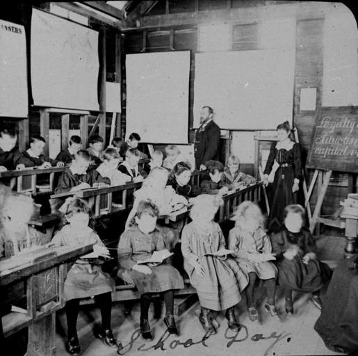Keywords: StateLibQld 1 141227 Interior of a school room at Postmans Ridge in the Helidon district, ca. 1902.jpg en Interior of a school room at Postmans Ridge in the Helidon district ca 1902 Teachers and students in a classroom of wooden tiered seats and benches Some girls sit on a bench at the front reading while the other students are writing The teachers stand and supervise On the blackboard can be read the words 'loyalty' patriotism' and 'capital' Posters and maps hang from the walls circa 1902 handle 10462/deriv/20774 Item is held by John Oxley Library State Library of Queensland PD-Australia StateLibQld-License Children of Queensland Schools in Queensland Classrooms in Australia Educators from Australia Blackboards in Australia 1902 in Queensland Black and white photographs School classrooms |