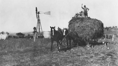 | Keywords: StateLibQld 1 153927 Harvesting on the farm, ca. 1915.jpg  en Harvesting on the farm ca 1915 A horse-drawn wagon is loaded high with hay and the farmer is standing on top of the load Two dogs are watching the horses Cattle are in the paddock to the left and a windmill is in the centre circa 1915 handle 10462/deriv/117498 Item is held by John Oxley Library State Library of Queensland PD-Australia StateLibQld-License Farms in Australia Wind wheels in Australia Horse transport in agriculture Hay wagons Agriculture in Queensland 1915 in Australia 1915 in agriculture Black and white photographs Tandem arrangement driving  |