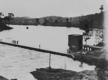 | Keywords: StateLibQld 1 162667 Flooding in Mount Crosby area.jpg en Flooding in Mount Crosby area Workers checking water levels near Mount Crosby weir handle 10462/deriv/110425 Item is held by John Oxley Library State Library of Queensland Contributor s Department of Works Brisbane City Council PD-Australia StateLibQld-License Floods in Queensland Water supply Mount Crosby Queensland Black and white photographs | ||||