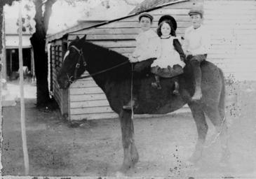 | Keywords: StateLibQld 1 174427 Children of the Cavanagh family, Roma, on a horse.jpg en Children of the Cavanagh family Roma on a horse Children of the Cavanagh family Roma posing on a horse They are left to right Mervyn Nena and Ken The boys wear caps shirts shorts stockings and boots Nena wears a hat pinafore dress stockings and boots A building stables and tree-trunk can be seen in the background circa 1903 handle 10462/deriv/100040 Item is held by John Oxley Library State Library of Queensland PD-Australia StateLibQld-License Children of Queensland Families of Australia Black and white photographic portraits of children Children's clothing of Australia Equestrian portrait photographs Roma Queensland 1903 in Australia Black and white photographs |