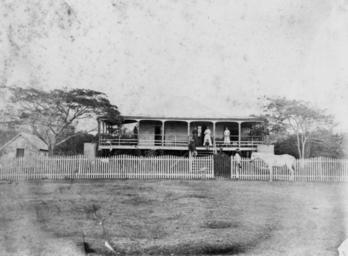 Keywords: StateLibQld 1 183615 Possibly Hawkins residence in Ingham, Queensland, ca. 1887.jpg supplied with photograph The highset residence has encircling verandahs and corrugated iron roof The family are posing near the front stairs circa 1887 handle 10462/deriv/130726 Item is held by John Oxley Library State Library of Queensland PD-Australia StateLibQld-License Sheds in Australia Verandas on single story Queensland houses Stairs in Australia Picket fences in Queensland Houses in Ingham Black and white photographs |