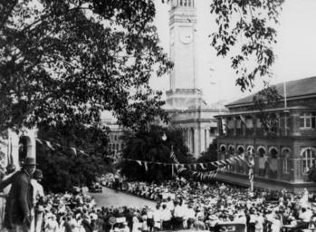 Keywords: StateLibQld 1 186531 Crowds gather on Albert Street to welcome the Duke of Gloucester to Brisbane, 1934.jpg en Crowds gather on Albert Street to welcome the Duke of Gloucester to Brisbane 1934 View of a civic reception for the Duke of Gloucester's visit to Brisbane People have crowded into Albert Square and all the way along Albert Street to see a procession pass by Long pieces of decorative bunting have been strung up across the road The Railway Statistics Office stands on the opposite side of the street on the right while the City Hall clock tower can be seen in the background 1934 handle 10462/deriv/133790 Item is held by John Oxley Library State Library of Queensland Colk A E PD-Australia StateLibQld-License 1934 visit to Brisbane by Henry Duke of Gloucester Crowds in Brisbane Brisbane City Hall Bunting in Australia Parades in Australia Albert Street Brisbane Black and white photographs of Brisbane Black and white photographs of parades |