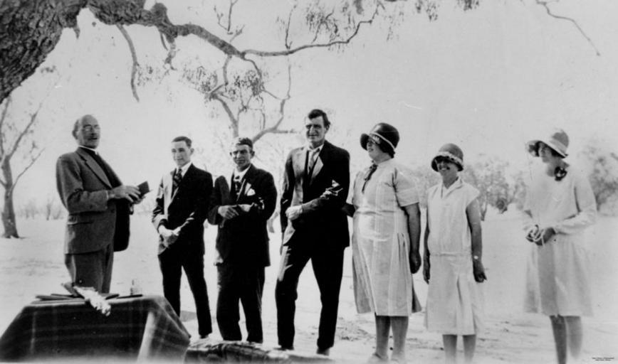 | Keywords: StateLibQld 1 189779 Outdoor wedding being performed under the Burke and Wills tree, near Boulia, Queensland, 1920s.jpg supplied with photograph Groom and groomsmen are dressed in dark suits the bride and bridesmaids are dressed in light short sleeved summer dresses with hats between 1920 1930 handle 10462/deriv/135593 Item is held by John Oxley Library State Library of Queensland PD-Australia StateLibQld-License Men's clothing of Australia Dresses in Australia Wedding ceremonies in Australia Headgear of Australia People with hats Boulia Queensland 1920 in Queensland Black and white photographs 1920s wedding dresses |